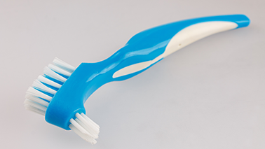 義歯用ブラシを使用し清掃していきます。その際、ゴシゴシと力を入れすぎないようにしてください。歯肉などに接する内面を磨きすぎると、すき間が出来る原因になります。汚れが残りやすい部分(クラスプなど)は丁寧に洗ってください。片まひなどがある人は、固定できる吸盤付ブラシを使えば片手で洗えます。